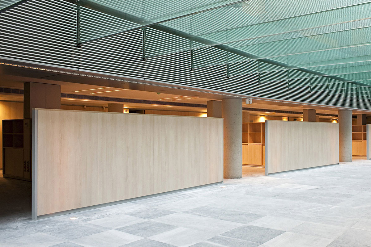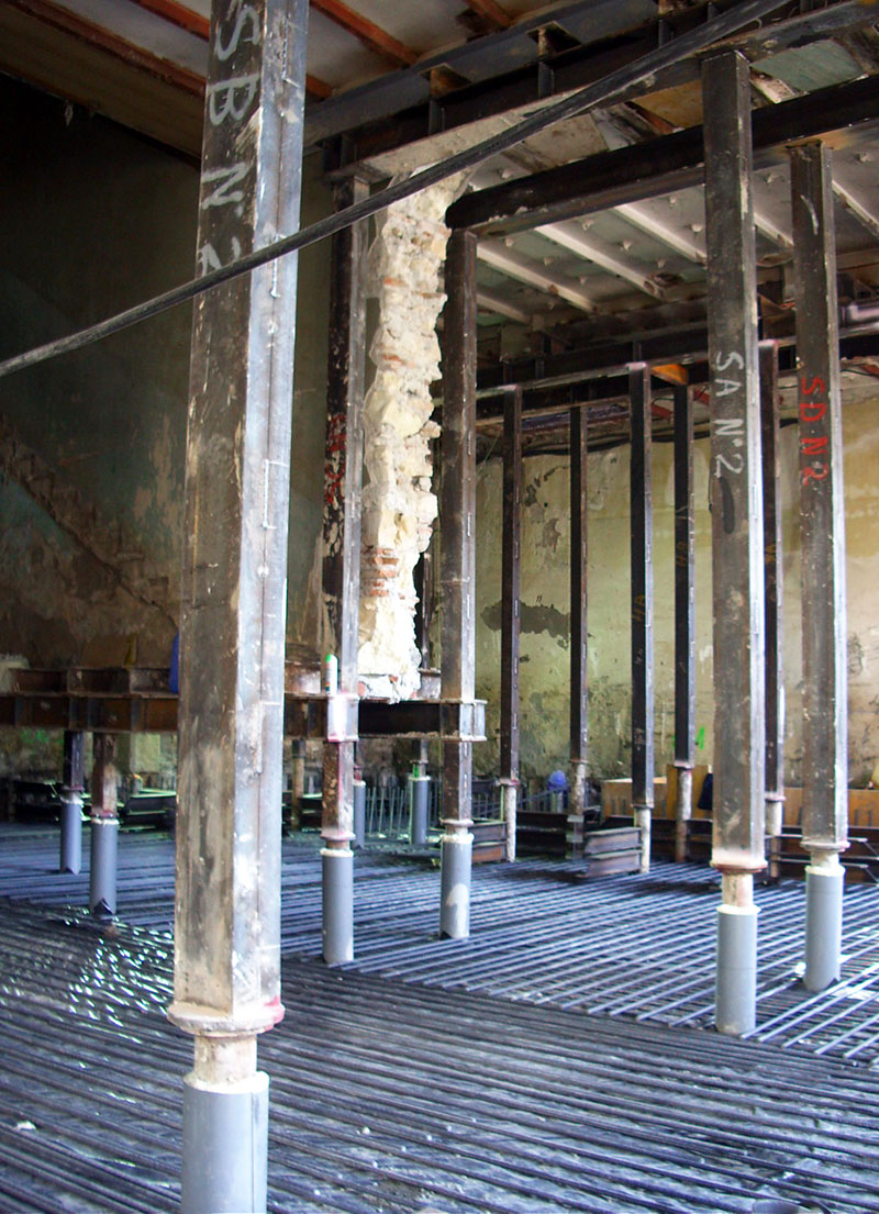 • Eliminación de los tres muros de carga interiores y sustitución por pilares y vigas metálicas